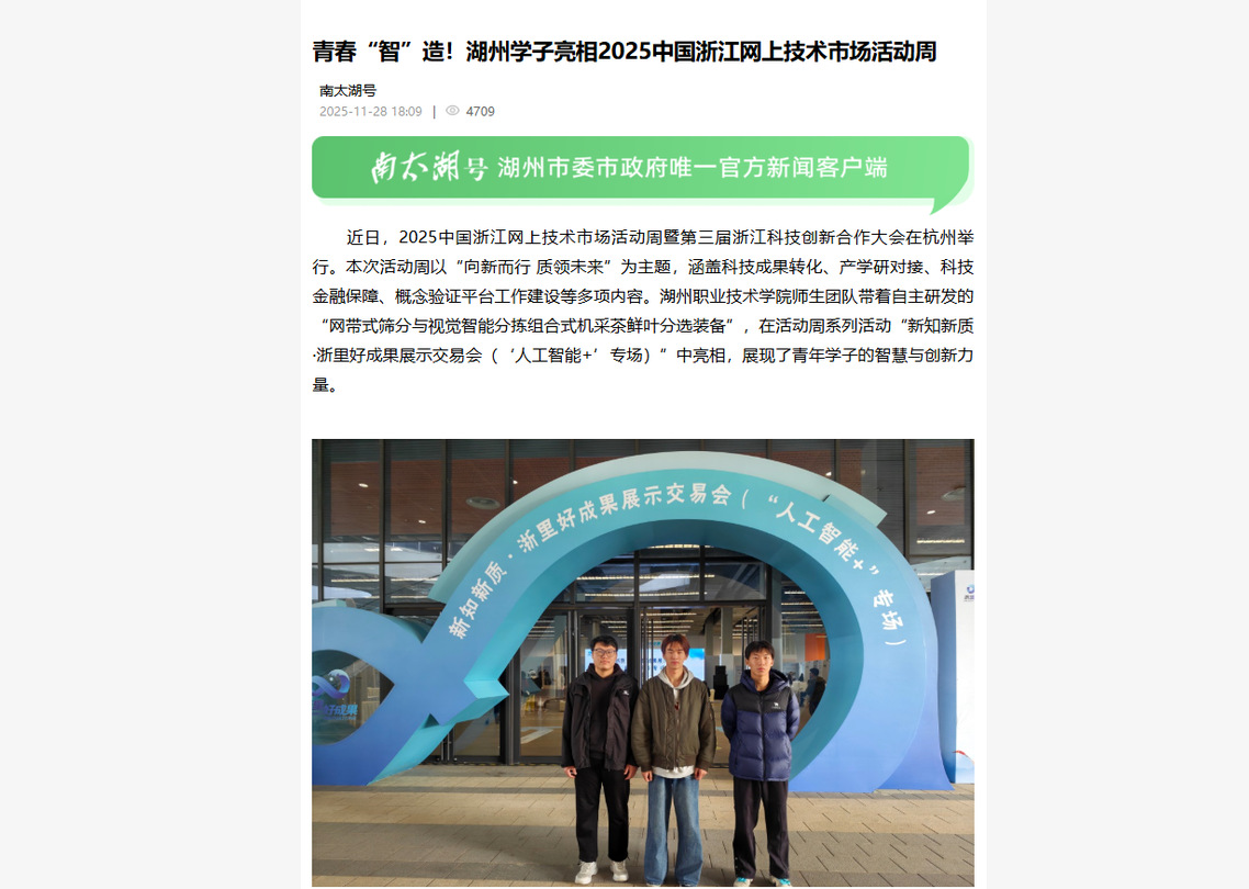 2025年11月28日《南太湖号》报道学校师生团队带自主研发装备亮相2025中国浙江网上技术市场活动周的相关新闻。