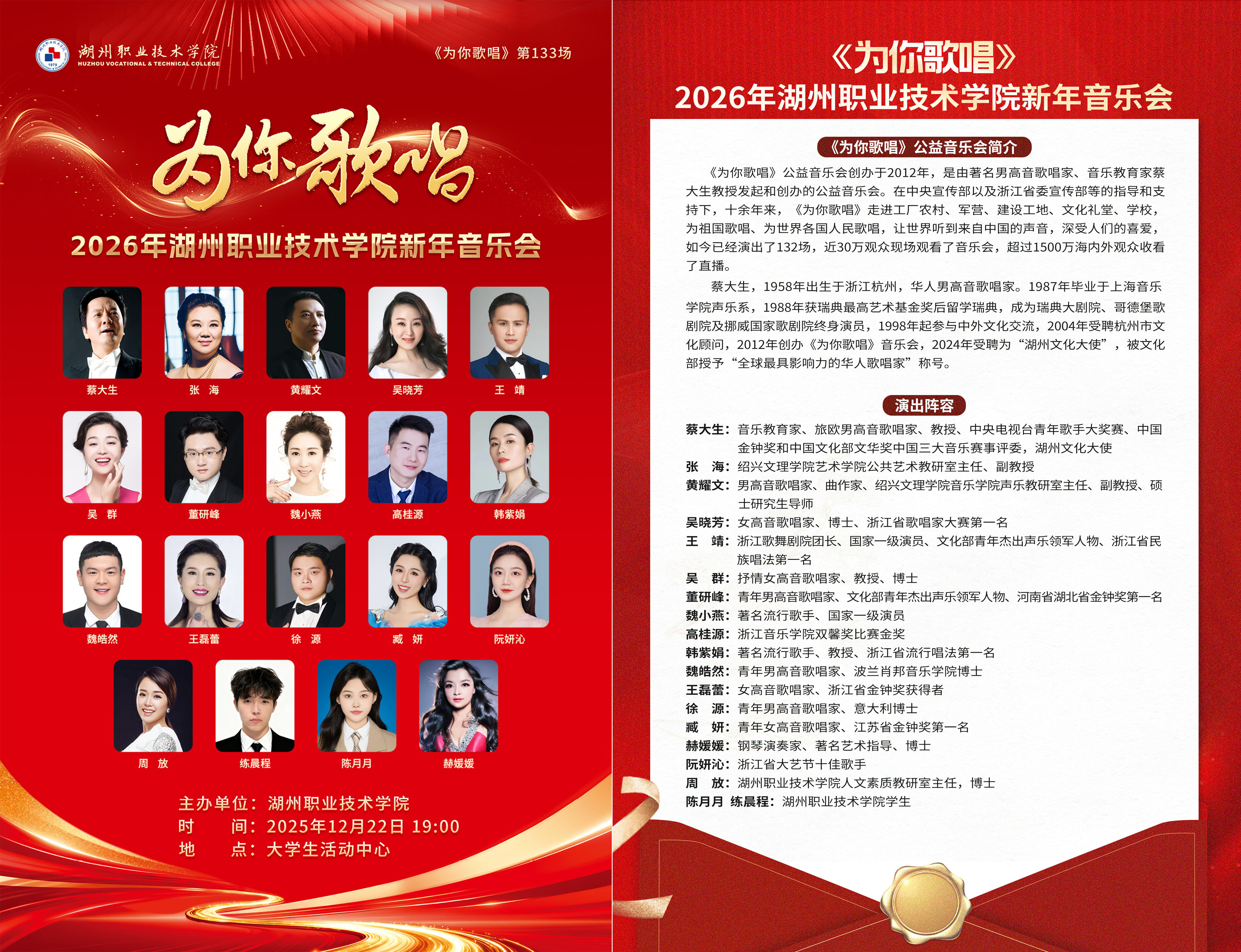 为打造公益性质的校社联动美育品牌,丰富校园文化生活,营造辞旧迎新的喜庆氛围,2025年年末,我校举办《为你歌唱》新年音乐会,邀请蔡大生、吴晓芳、吴群、王靖等优秀音乐家、歌唱家一同走进校园,联手学校师生,带来最美的艺术作品和新年祝福。现将相关事宜通知如下:
