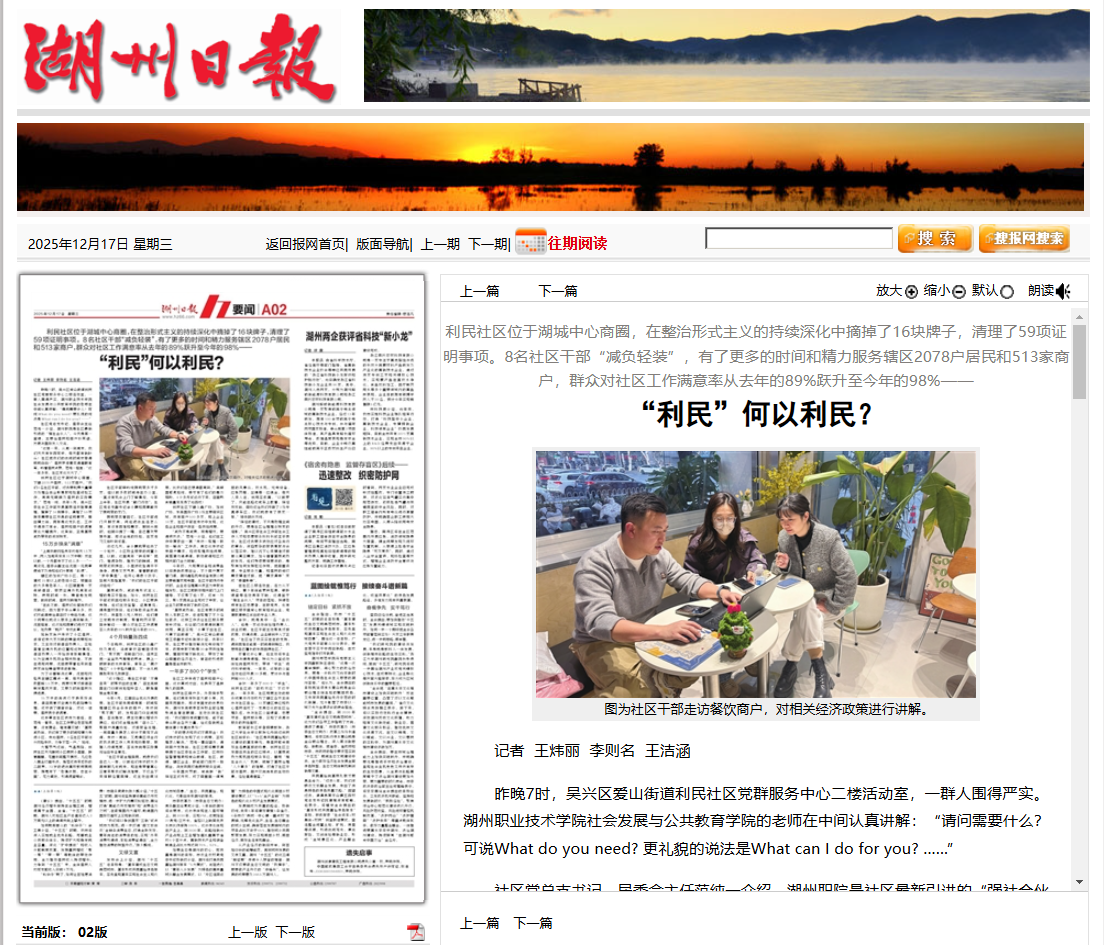 2025年12月17日《湖州日报》报道学校社会发展与公共教育学院教师作为社区“强社合伙人”给居民和商户补英语的相关新闻