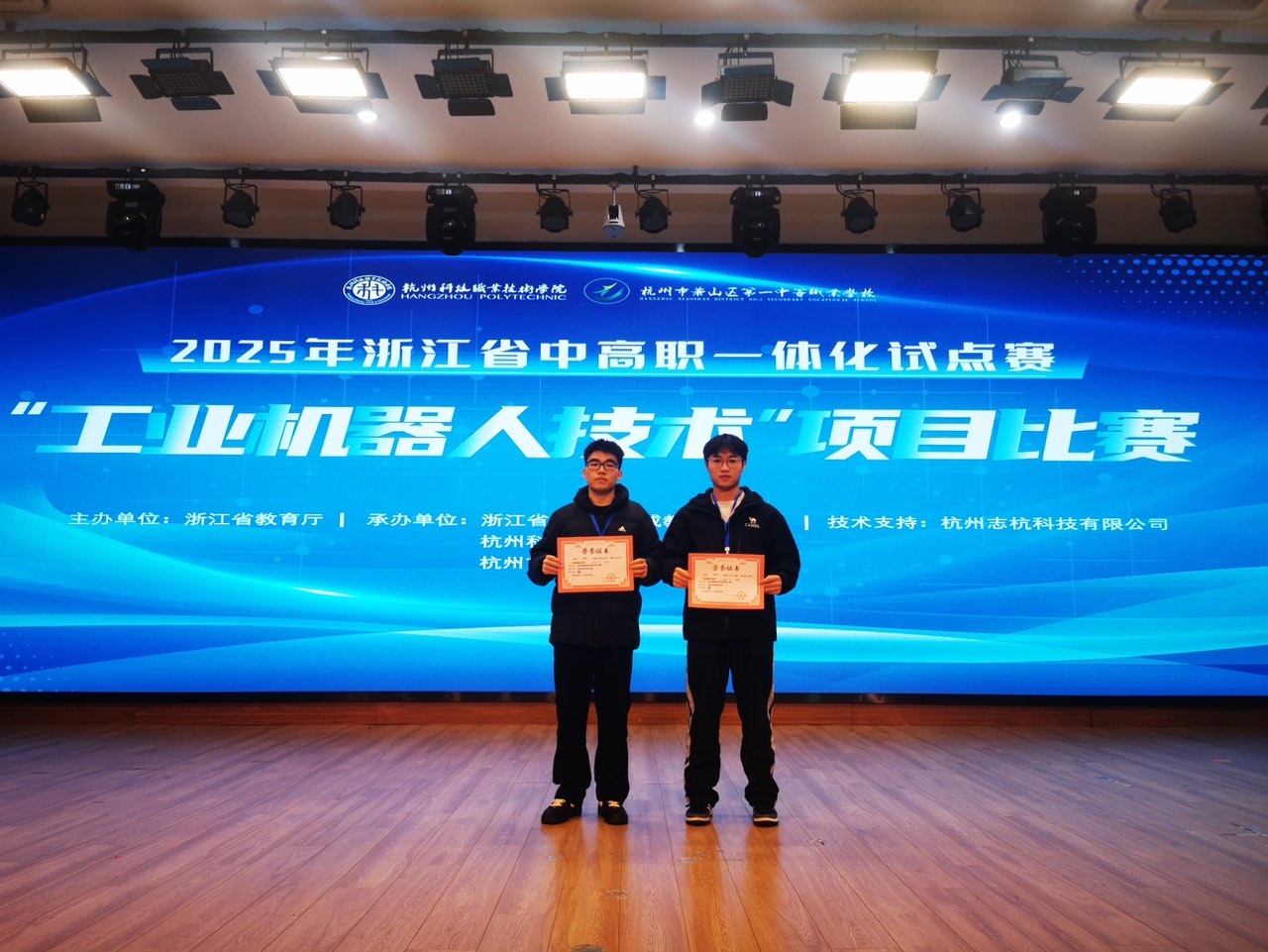 近日,2025年浙江省中高职一体化试点赛“工业机器人技术”项目在杭州市萧山区第一中等职业学校成功举办。由我校工业机器人技术专业教师张芹、王英杰,联合德清职业中专、湖州信息工程学校的教师共同指导的学生团队,凭借过硬的专业技能与出色的团队协作,在激烈竞争中脱颖而出,最终荣获一等奖和三等奖各一项。