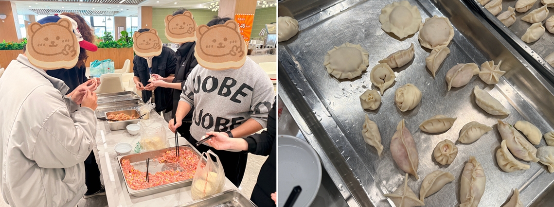 活动现场,食堂工作人员提前准备好两种特色馅料——鲜香弹牙的虾仁玉米馅与经典家常的白菜猪肉馅,兼顾口味差异与营养搭配。同学们围坐在摆满食材的长桌前,在食堂师傅的示范指导下,揉面、擀皮、包馅,动作从生疏到熟练,食堂的蒸汽氤氲着每个人的脸颊,也温暖了整个活动现场。学院辅导员也来到同学们中间,与大家一同包饺子、话家常,将学院的温暖关怀传递给每一位同学。活动特别设置“创意饺子评比”环节,同学们制作形态各异的饺子摆满托盘,最终评选出的“最美饺子”获得学院特色文创礼品。