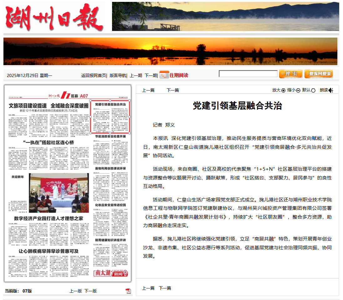 2025年12月29日《湖州日报》报道学校信息工程与物联网学院与旄儿港社区开展党建联建的相关新闻