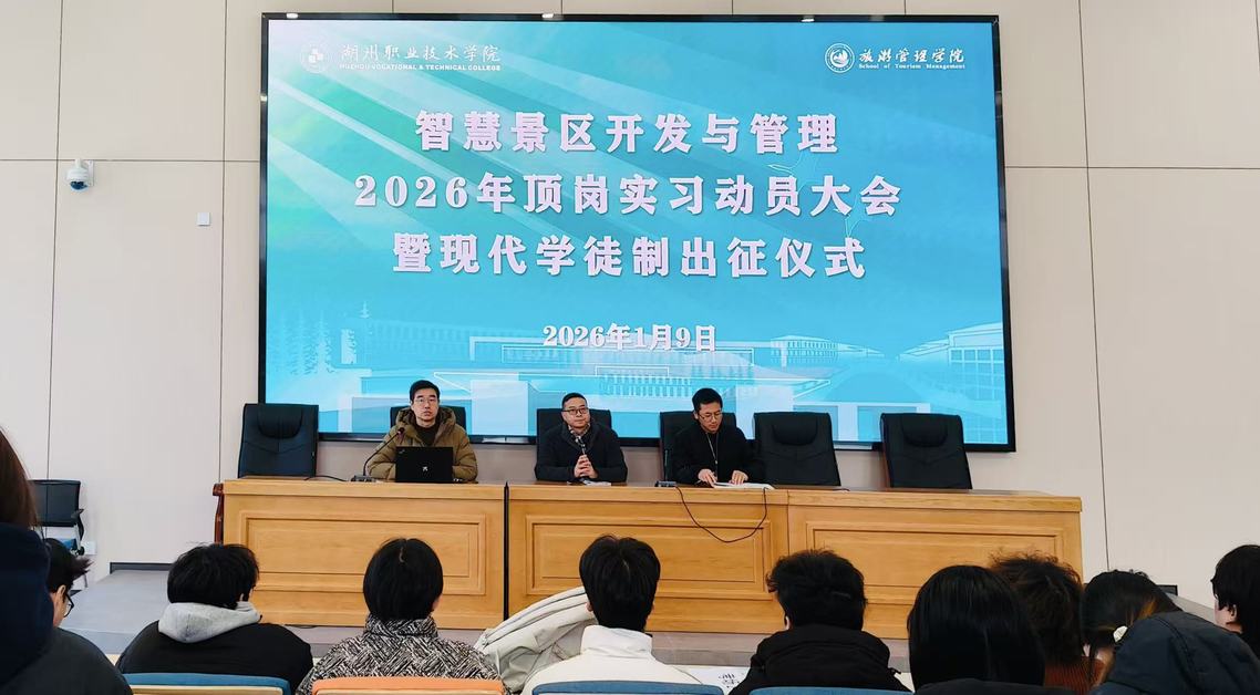 为助力智慧景区专业学生顺利开启顶岗实习,明确实习要求、凝聚奋进力量,确保实习工作有序推进,1月9日智慧景区开发与管理专业召开2026年现代学徒制顶岗实习动员大会暨出征仪式。学院教学副院长、党总支副书记、智慧景区专业主任、教师代表及24级智慧景区专业全体77位学生参加动员大会。