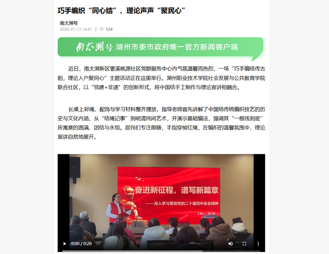 2026年1月13日《南太湖号》报道我校社会发展与公共教育学院以“党建+非遗”的创新形式,将中国结手工制作与理论宣讲相融合的相关新闻