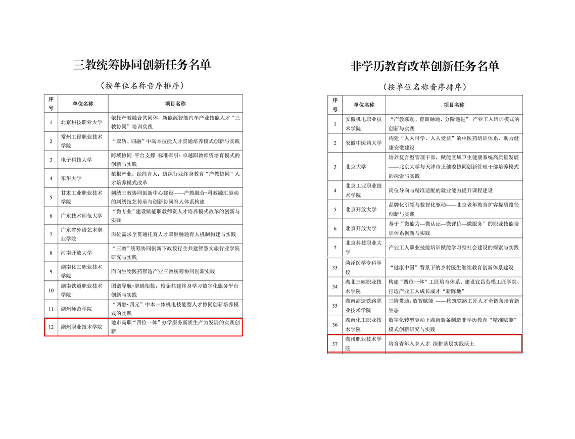 1月19日,教育部职业教育与成人教育司公示了第三批高等继续教育领域学习型社会建设重点任务名单。由发展规划处、职业教育与产业发展研究所牵头组织申报的《地市高职“四位一体”办学服务新质生产力发展的实践创新》入选“三教统筹”协同创新任务,继续教育学院、湖州青年入乡发展学院牵头组织申报的《培育青年入乡人才 深耕基层实践沃土》入选“非学历教育”改革创新任务。